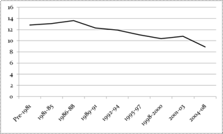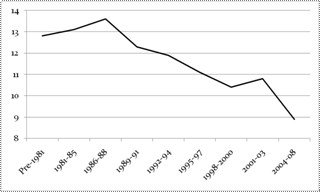 ▪ Then things start heading downhill—a little above or below 12 in 1989-1994, dropping sharply to 11 and below after 1995.